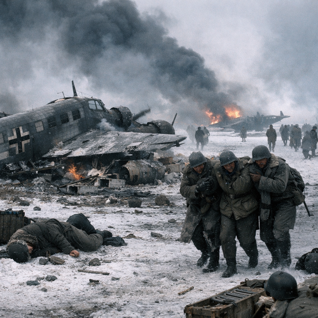 Der Flugplatz lag jedoch in Reichweite sowjetischer Artillerie. Schon Wochen vor seinem Fall war der Betrieb nur noch unter extremen Risiken möglich. Einschläge auf Start- und Landebahnen, zerstörte Maschinen am Boden und chaotische Zustände prägten das Bild. Dennoch blieb Pitomnik bis zuletzt der einzige Platz, der eine halbwegs geordnete Luftversorgung erlaubte.