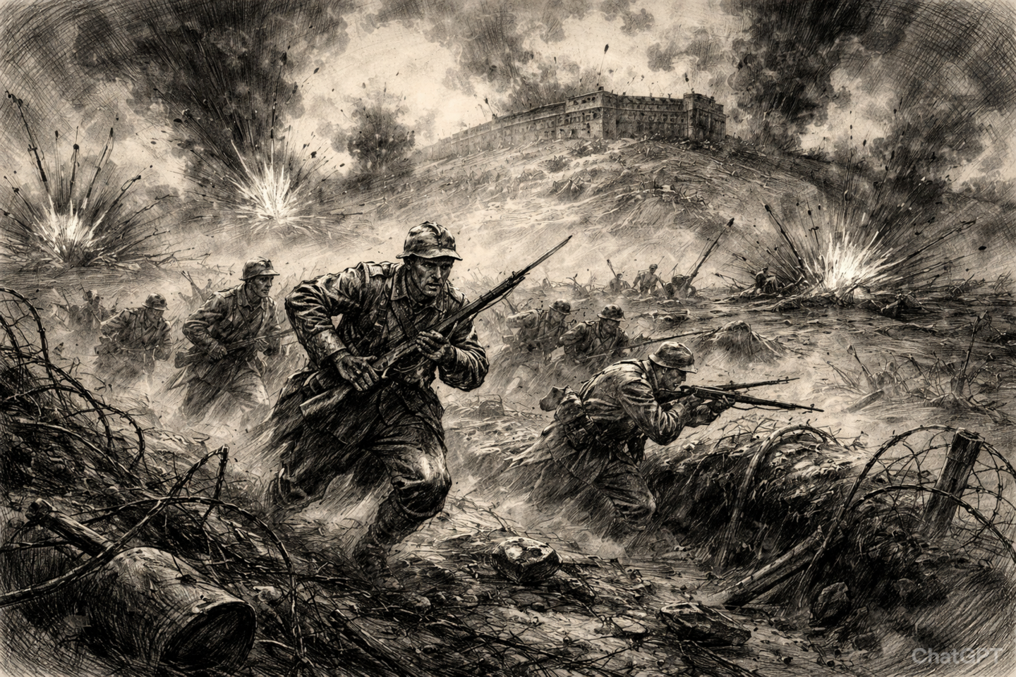 Am 21. Februar 1916 eröffnete die deutsche Artillerie ein bis dahin beispielloses Trommelfeuer. Innerhalb weniger Stunden verwandelten hunderttausende Granaten das Vorfeld Verduns in eine Trümmerlandschaft. Bereits am 25. Februar fiel das strategisch wichtige Fort Douaumont nahezu kampflos in deutsche Hände – ein schwerer Schlag für die französische Moral.